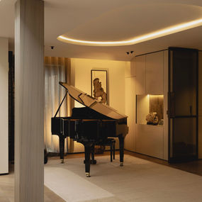 on the top floor you 'll find the parental getaway, a luxurious master bedroom with a private home spa. the illuminated onyx panelling paired with the bubbly chandeliers gives a richness within this private quarter. a gas fireplace is found at the heart of the sleeping area, warming up the cozy nights.